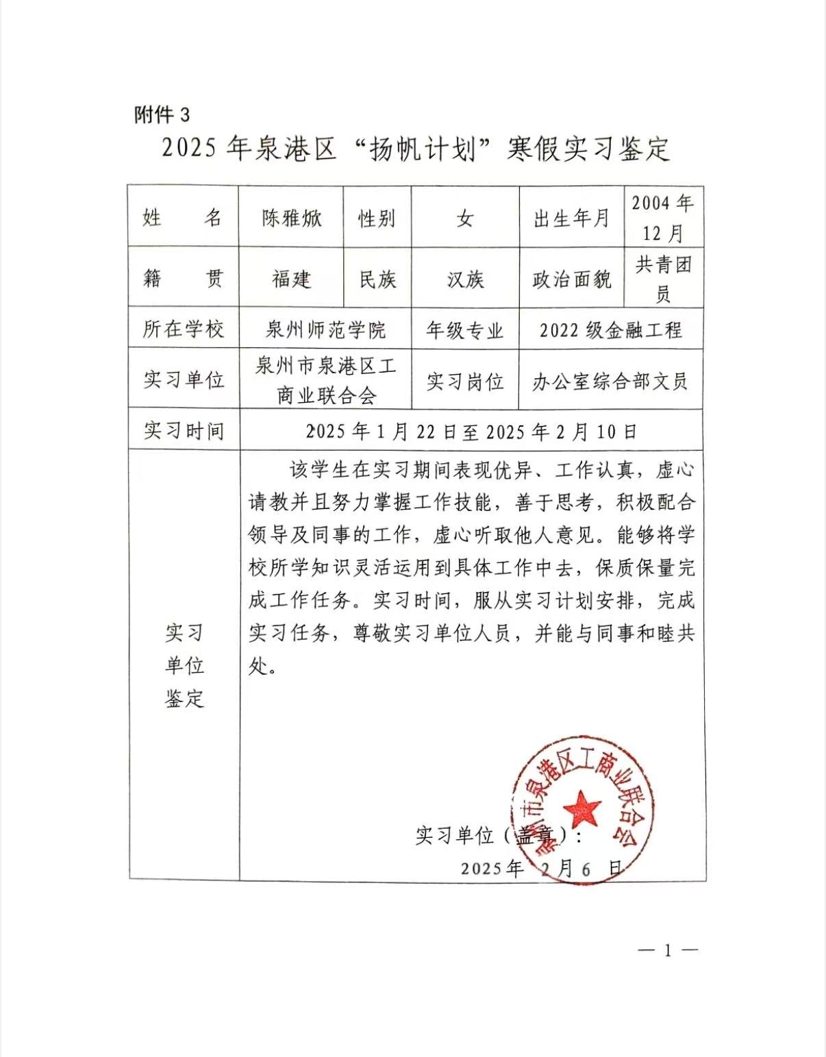 陈雅焮,陈守仁商学院2022级金融工程专业学生。她在“扬帆计划”实习期间,担任泉州市泉港区工商业联合会办公室综合部文员一职。日常工作中,她主要负责商会公众号的内容供稿,包括深入挖掘商会会员企业的发展故事、行业动态,精心撰写具有深度与可读性的文章;及时整理并发布工商联组织的各类会议、活动资讯,确保信息的准确传达与有效传播,为商会的宣传工作贡献力量。