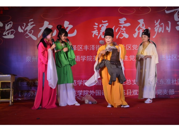 晚会在独具特色的太鼓表演中拉开序幕,鼓乐齐鸣,吸引了众多群众围观。首先,外国语学院党总书记李丽雪给老人们送上真诚的节日祝福,并希望通过晚会进一步宣传发扬“敬老”这一传统美德,让“敬老”变成一种风尚。此次晚会形式丰富多样,有诙谐幽默的小品,有青春激昂的爵士舞,有反转经典的舞台剧等等。最后,晚会在双语才子自创的诗歌歌颂泉州人杰地灵、钟敏毓秀的《闽南赋》朗诵中落下帷幕。社区老年朋友们对外国语学院英日双语专业学生党支部全体同学的表演赞不绝口。