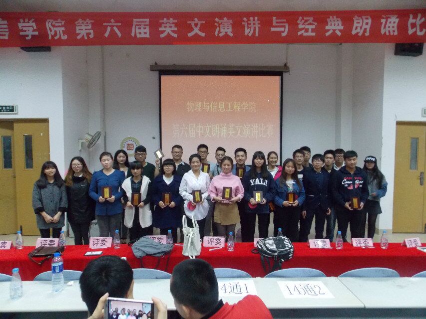 4月12日晚7:00,物理与信息工程学院第六届中英文演讲比赛在理工楼218教室隆重举行。