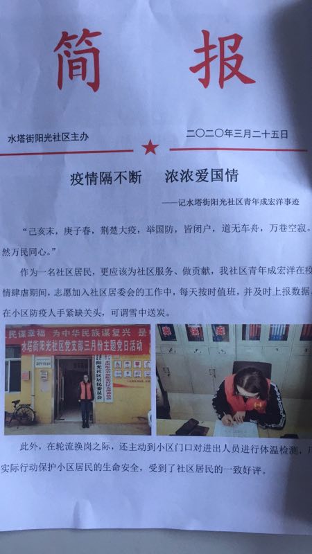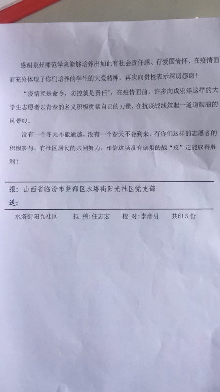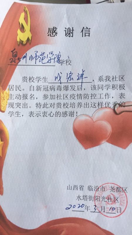 近日,我院2018级环境科学一班的成宏洋在家乡报名加入抗疫志愿者的队伍,用实际行动来报效祖国。因表现突出,受到了山西省临汾市尧都区水塔街阳光社区的表彰。