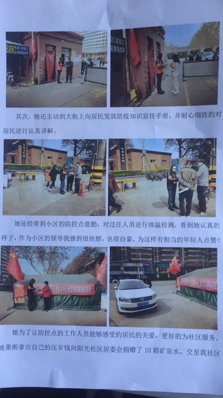 疫情期间,她工作认真负责,每天按时值班,及时上报社区居民体温测量的数据。其次,她还主动向居民发放防疫知识宣传手册并耐心解答居民的问题。成宏洋关爱社区居民,积极为社区服务,捐赠了10箱矿泉水。她关心国家,在全国抗疫紧要关头,她还向中国红十字总会捐赠了200元现金。