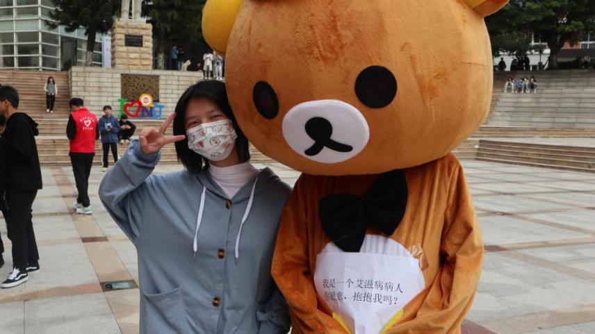 “我是一个艾滋病病人,你愿意抱抱我吗?”贴有“艾滋病”标签的轻松熊晃动着脑袋,无声地向同学们发问。刚开始,大家都有些拘谨,犹豫着不敢上前。这时,人群中忽然走出一位同学,主动拥抱了“艾滋病病人”。在这位同学的带领下,大家纷纷上前拥抱我们可爱的“病人”。这一互动,使得大家明白了拥抱等日常交往行为,并不会传播艾滋病病毒。“艾”的抱抱不仅让大家的身体相拥,更有效拉近了同学们对艾滋病病人的正确认识。