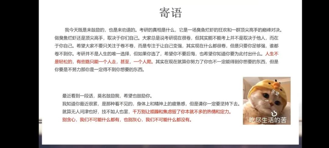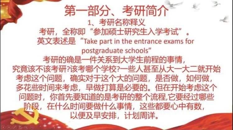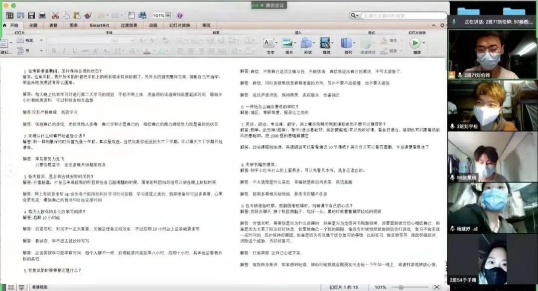 其中,文学与传播学院的主讲人叶夏影通过思维导图的形式分择校、复习和实习三个模块进行讲述;化工与材料学院2018级化工与制药类专业的王进翔为正在备考的学弟学妹们推荐了化工、政治、英语、数学的相关学习书籍,并附上了相关链接;
