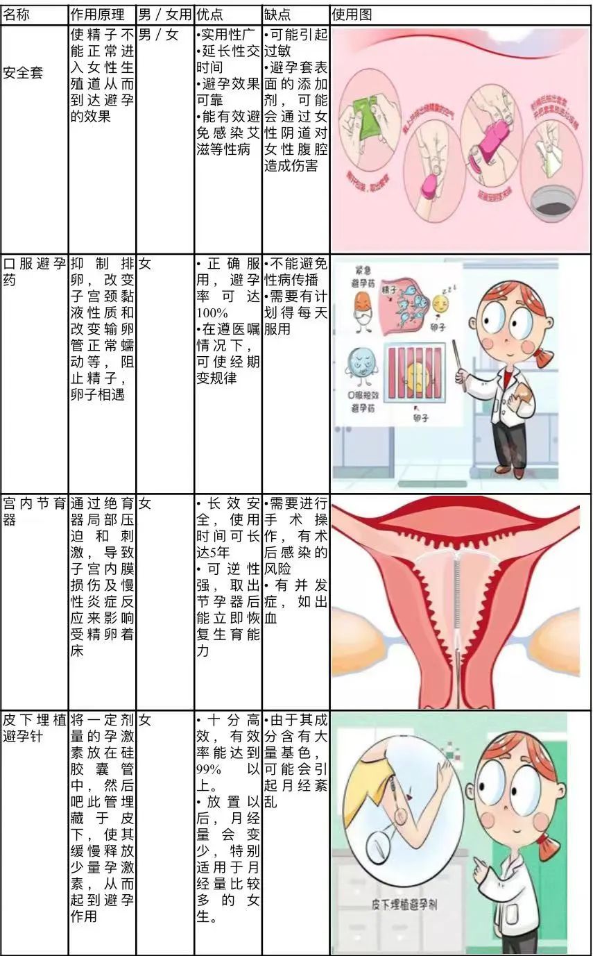 要知道科学避孕需遵循高效、长效、可逆的原则,避孕成功率高的常见避孕方式包括安全套,口服避孕药,宫内节育器,皮下埋植避孕针等等,大家可以通过下方的表格了解一下。