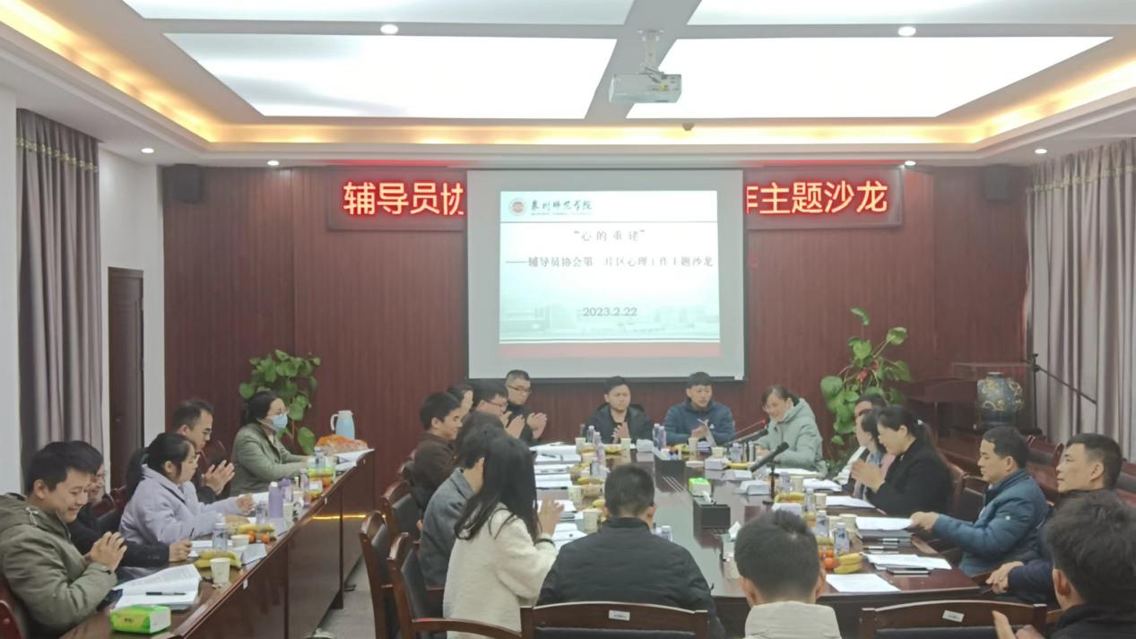 2月22日上午,校辅导员协会第二片区全体成员在陈伟利体育馆二楼会议室举行“心的重建”心理工作主题沙龙会。校团委书记黄丹琳、音舞学院党委副书记、辅导员协会副会长胡秋娇、工商学院党委副书记曾文超、教科学院党委副书记刘宗安、体育学院党委副书记李遵义、工商学院、教科学院、音舞学院、体育学院全体辅导员参加此次沙龙会。