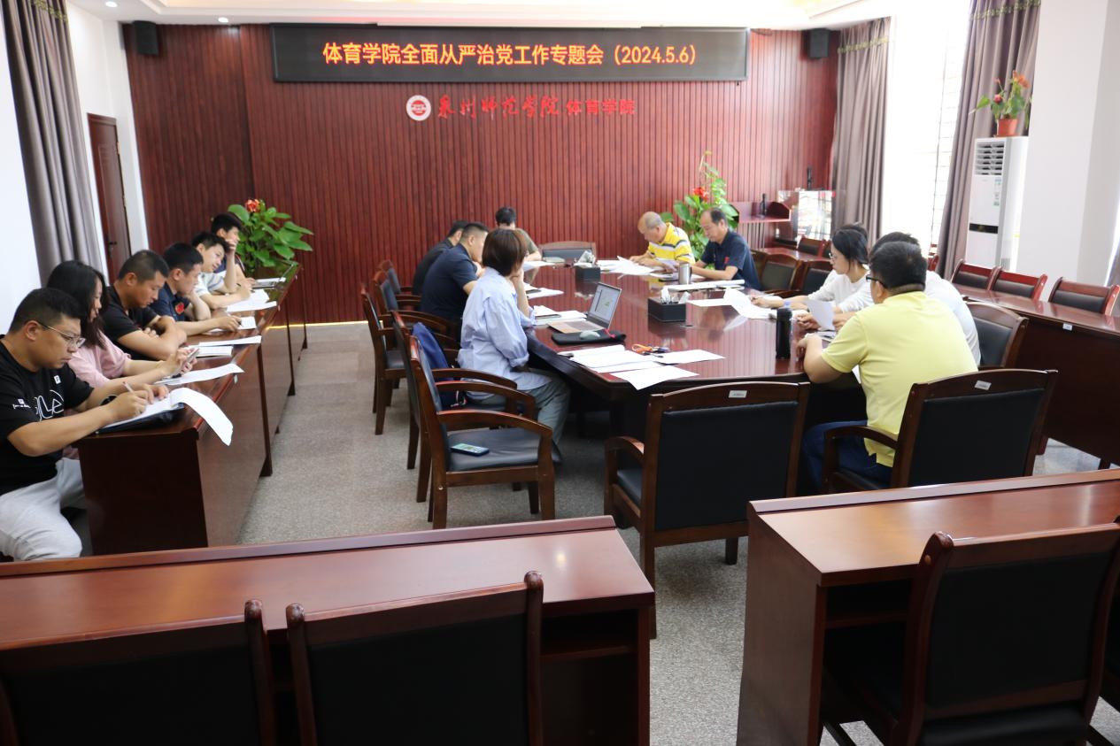 董清海强调,院党委要以习近平新时代中国特色社会主义思想为指导,全面深入学习贯彻党的二十大和二十届二中全会精神,认真落实健全全面从严治党体系的任务要求,以彻底的自我革命精神一刻不停推进全面从严治党。一要深入学习宣传贯彻党的二十大精神,持续巩固拓展主题教育成果,深化拓展“三争”行动,推进党建和思政工作“十抓十重”实施方案;二要加强监督,为推动体育学院高质量发展保驾护航;三要健全全面从严治党体系,加强对学院纪委的领导与支持,推进政治监督具体化、精准化、常态化;四要驰而不息加强作风建设,坚持推进作风建设常态化长效化,坚持党性党风党纪一起抓,让党员、干部受警醒、明底线、知敬畏。坚持师德师风第一标准,开展常态化师德教育;五要严守学院安全稳定底线、意识形态安全红线、学生思想政治高线,确保学院安定稳定;六要压实领导班子的主体责任、党组织书记的第一责任、班子成员的“一岗双责”,确保全面从严治党落到实处。