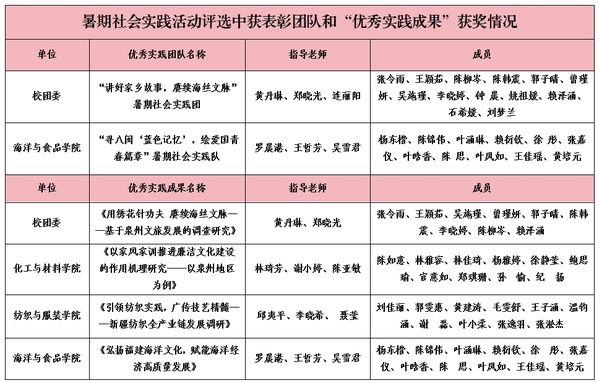 10月8日,中共福建省委教育工作委员会公布了“追寻领袖足迹 体悟伟大变革”2024年全省大学生暑期社会实践活动评选结果。“讲好家乡故事,赓续海丝文脉”暑期社会实践团、“寻八闽‘蓝色记忆’,绘爱国青春篇章”暑期社会实践队获评“优秀实践团队”,谢小婷、张珊珊两位老师获评“优秀实践个人”,《用绣花针功夫 赓续海丝文脉——基于泉州文旅发展的调查研究》等四项成果获“优秀实践成果”。