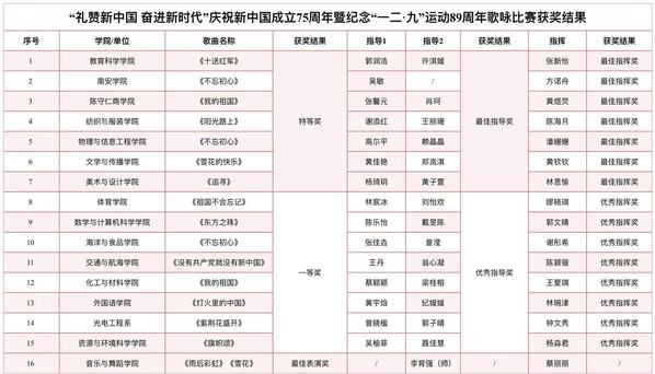 本次比赛共设置了特等奖7个,一等奖8个,表演奖1个,最佳优秀指导奖13名,优秀指导奖16名,最佳指挥奖7名,优秀指挥奖8名,并进行现场颁奖。校团委