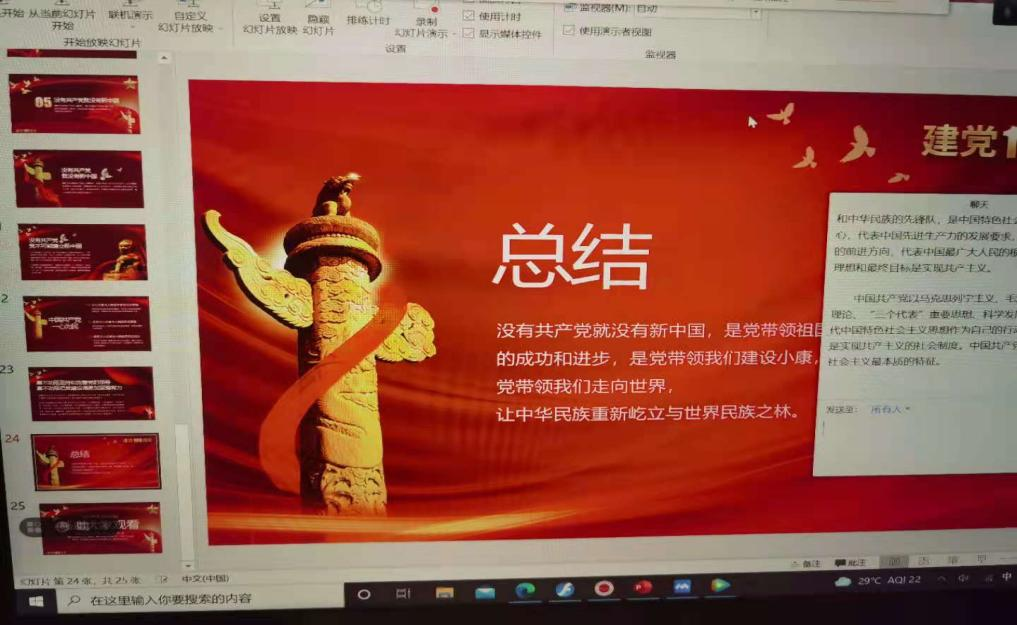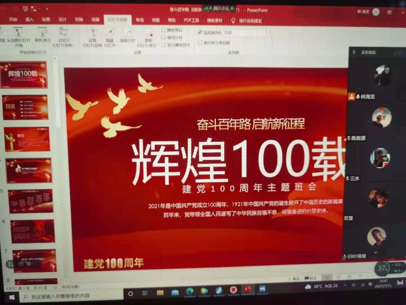 在一片热烈的掌声中,本次“我是党史领学人|学习习近平总书记在庆祝中国共产党建党100周年大会上的重要讲话”主题团日活动正式开始。团支书以《建党伟业》的一段视频让同学们再次忆起那段峥嵘岁月,加深了同学们对中国共产党认识。随后大家一同观看《习近平总书记在庆祝中国共产党建党100周年大会上的重要讲话》,同学们感触良多:立足中国共产党百年华诞的重大时刻和“两个一百年”历史交汇的关键节点,我们回望光辉历史、擘画光明未来。习近平总书记的讲话是新时代中国共产党人不忘初心、牢记使命的政治宣言,是我们党团结带领人民以史为鉴、开创未来的行动指南。我们要牢记初心使命,坚定理想信念,践行党的宗旨,永远保持同人民群众的血肉联系。接着,团支书开展党史知识竞答赛,同学们踊跃参与、积极互动,争先表达自己对中国共产党及其历史的理解。同学们深刻地认识到作为当代大学生肩负的历史责任,明白坚定理想信念、立志成才的重要性。