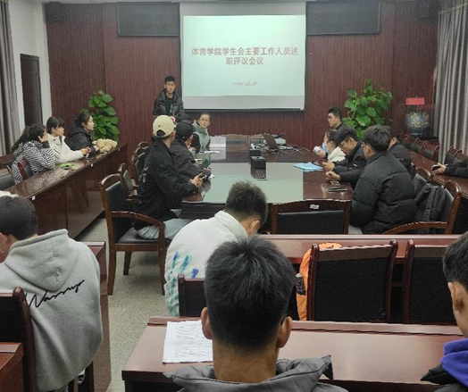 为推动我院学生会改革工作,落实学生会组织述职评议制度,增强学生干部服务能力、服务水平、服务意识,20211227日,在陈伟体育馆二楼会议室体育学院召开2021学年体育学院学生会主述职评议会。体育学院团委书记陈美婧、辅导员林增辉、两委会全体部门负责人参加会议并担任评委。