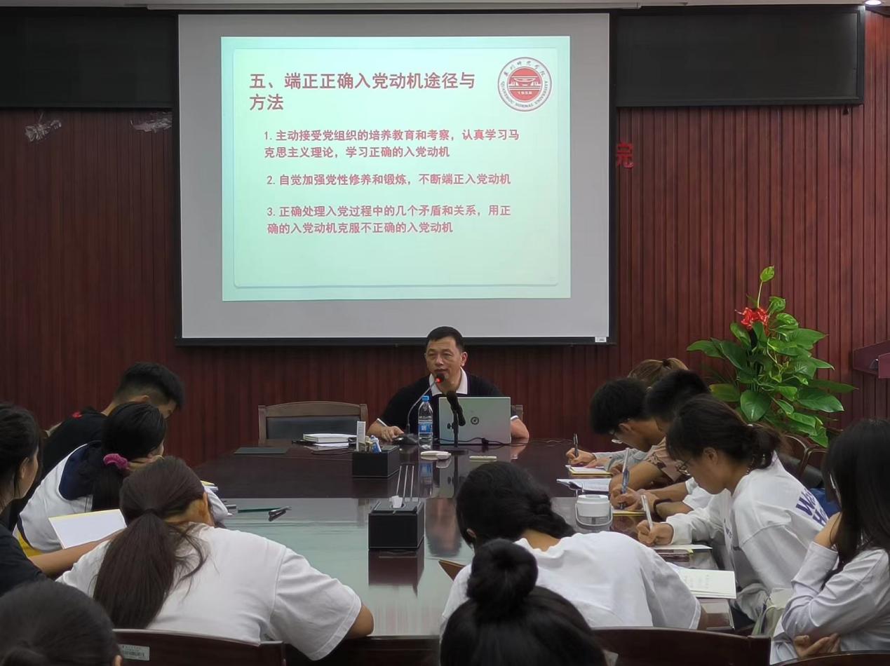 10月9日,体育学院党委副书记、纪委书记李遵义在陈伟利二楼会议室为入党积极分子上了题为《端正入党动机,争取早日加入党组织》的专题党课。