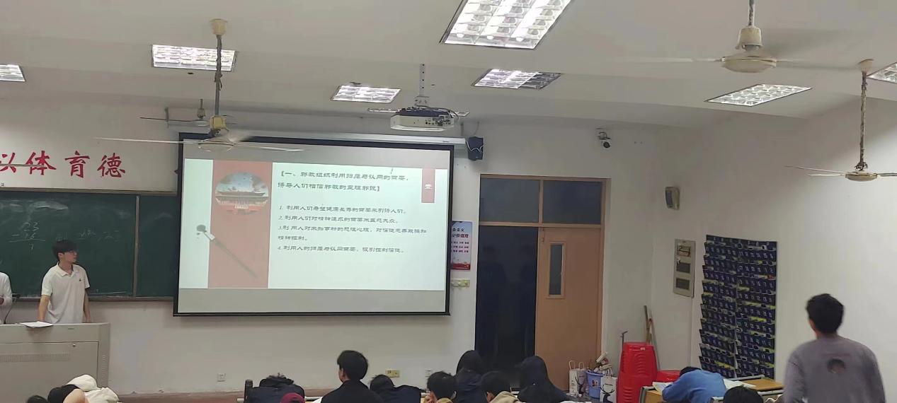 班会上,各班级首先观看反邪教教育动漫视频短片无邪兔降魔记,并讲解“法轮功”“全能神”和“门徒会”等邪教组织危害社会的真实案例让在场的同学们深刻感受到了邪教对个人、家庭和社会的巨大危害。接着,班会进入小组讨论环节。每组同学围绕“如何判断一个组织是否是邪教?“邪教是如何进行欺骗的?”等议题展开了激烈的讨论。在讨论过程中,同学们积极发言,交流观点,相互启发,进一步加深同学们对邪教的认识,提高了识别和防范邪教的能力。