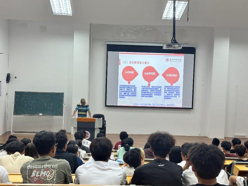 课堂上,董清海老师从百年党史的教育引擎、耀眼伟绩、精神传承三个主要内容阐述新时代青年学子学好党史的重要性。他从中国共产党成立时初期,到新中国成立的辉煌历程,改革开放的伟大实践,再进一步阐述新时代中国共产党的历史使命,沿着历史的足迹诉说着这一段段波澜壮阔、震撼人心的历史篇章,在回顾党的百年峥嵘岁月中,向同学们深入挖掘其中蕴含的宝贵精神品质。他指出,这段历史不仅是中国共产党领导中国人民英勇奋斗、不懈追求的缩影,更是中华民族走向伟大复兴的壮丽史诗,同时他寄语在座的同学们要在学习党史中坚定理想信念,不懈奋斗、奋勇向前。课堂最后,董清海老师勉励新生们,要学史明理、学史增信、学史崇德、学史力行,将国家需求与个人的成长成才紧密相连,在勤学苦练中练就真本领,以更加饱满的热情、更加昂扬的斗志投入到学习和实践中去。