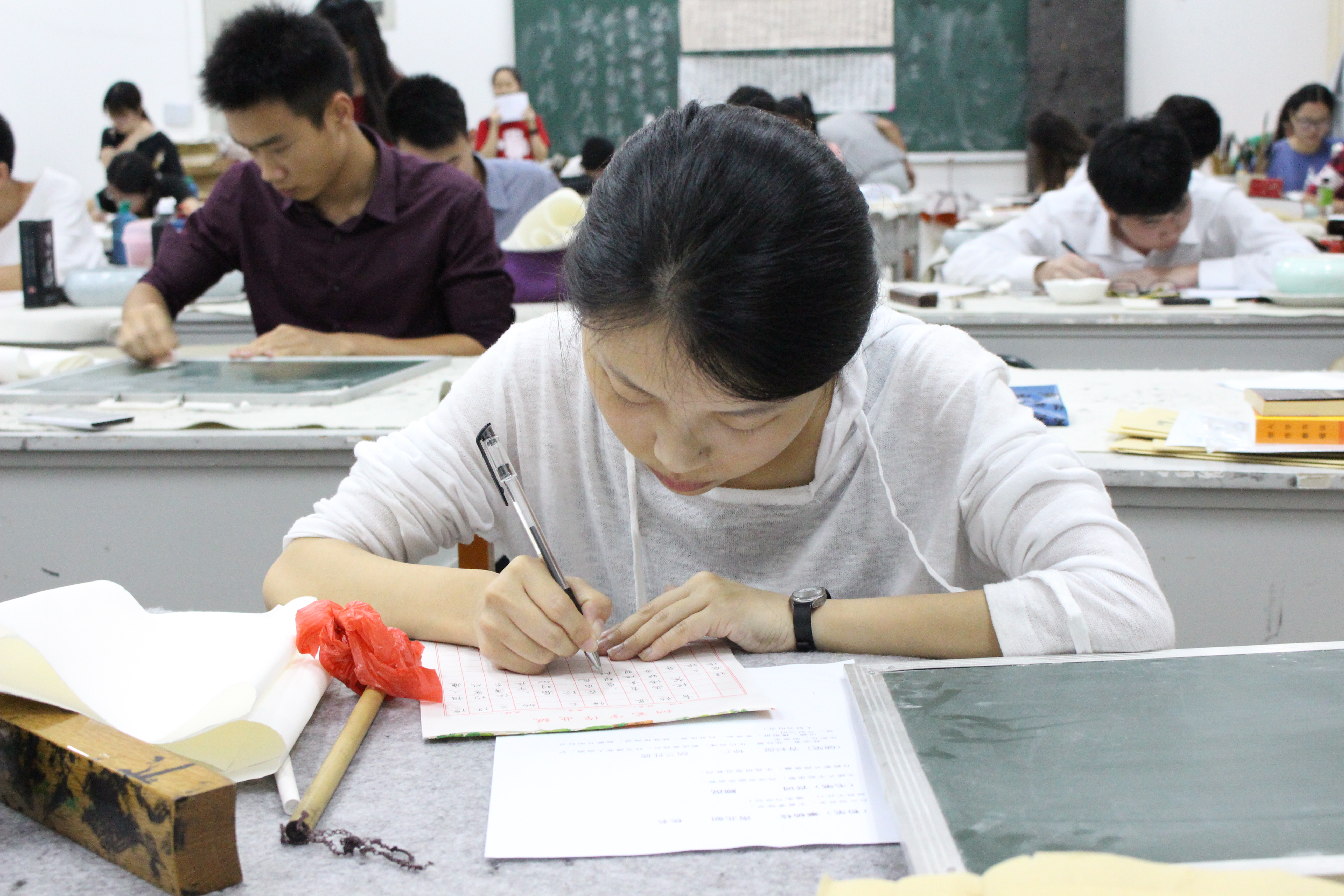 比赛采用积分制,由粉笔、毛笔和硬笔三部分组成,每项计入总分。比赛主要以书写经典诗文为主,其中粉笔比赛的题目为《攀杨枝》,硬笔比赛的题目为《青衫湿·悼亡》,毛笔比赛的题目则为《宫词》。每位选手要在2个小时之内独自完成三幅作品。我院12广电黄志根、13中一王鑫辉以及13中一陈书平参赛。在紧张的氛围中,我院选手沉着应对,游刃有余。三人作品风格各不相同,以良好的心理素质以及认真严谨的态度展现自己的实力。据了解,比赛结果将在近期公布。