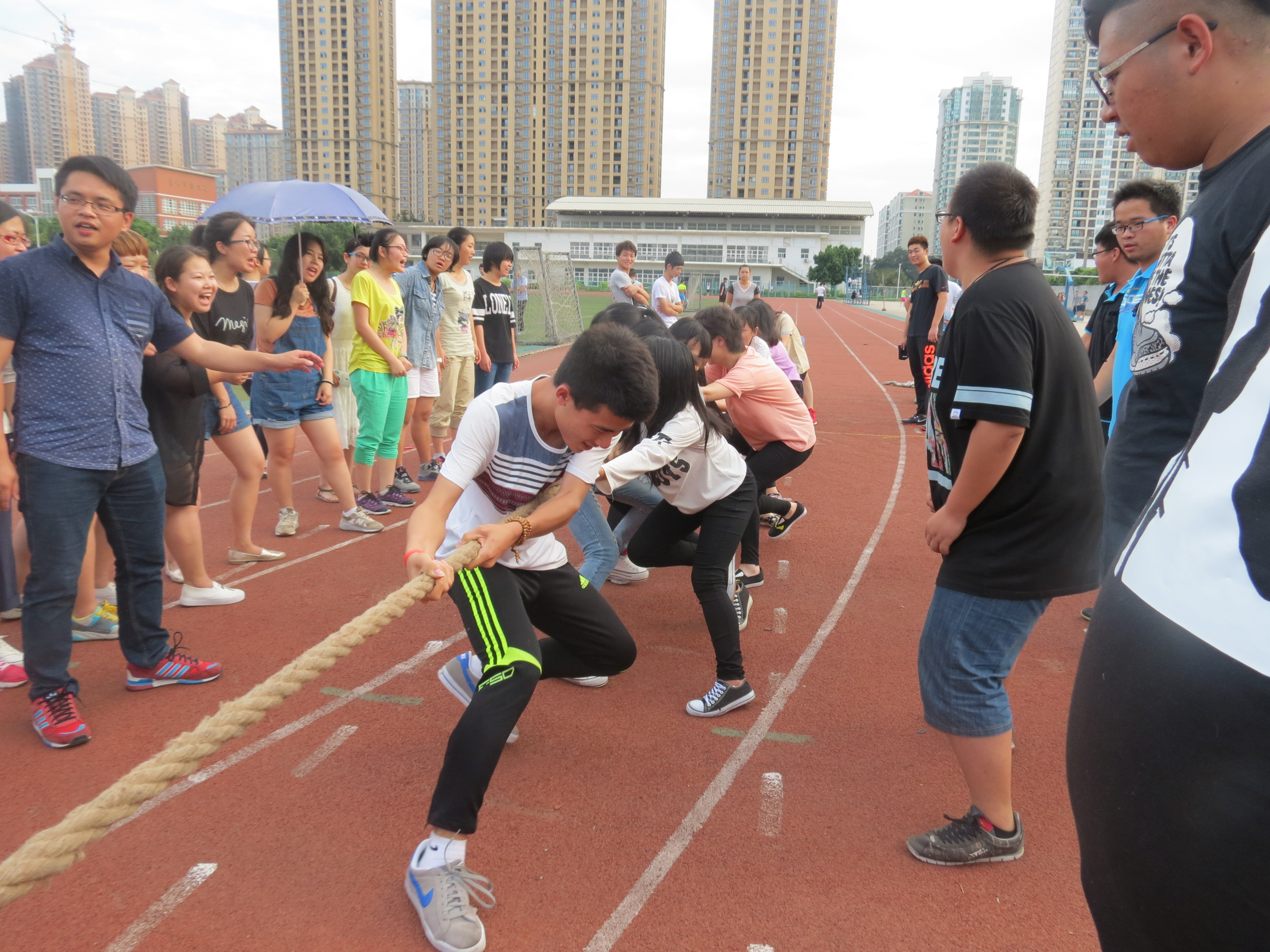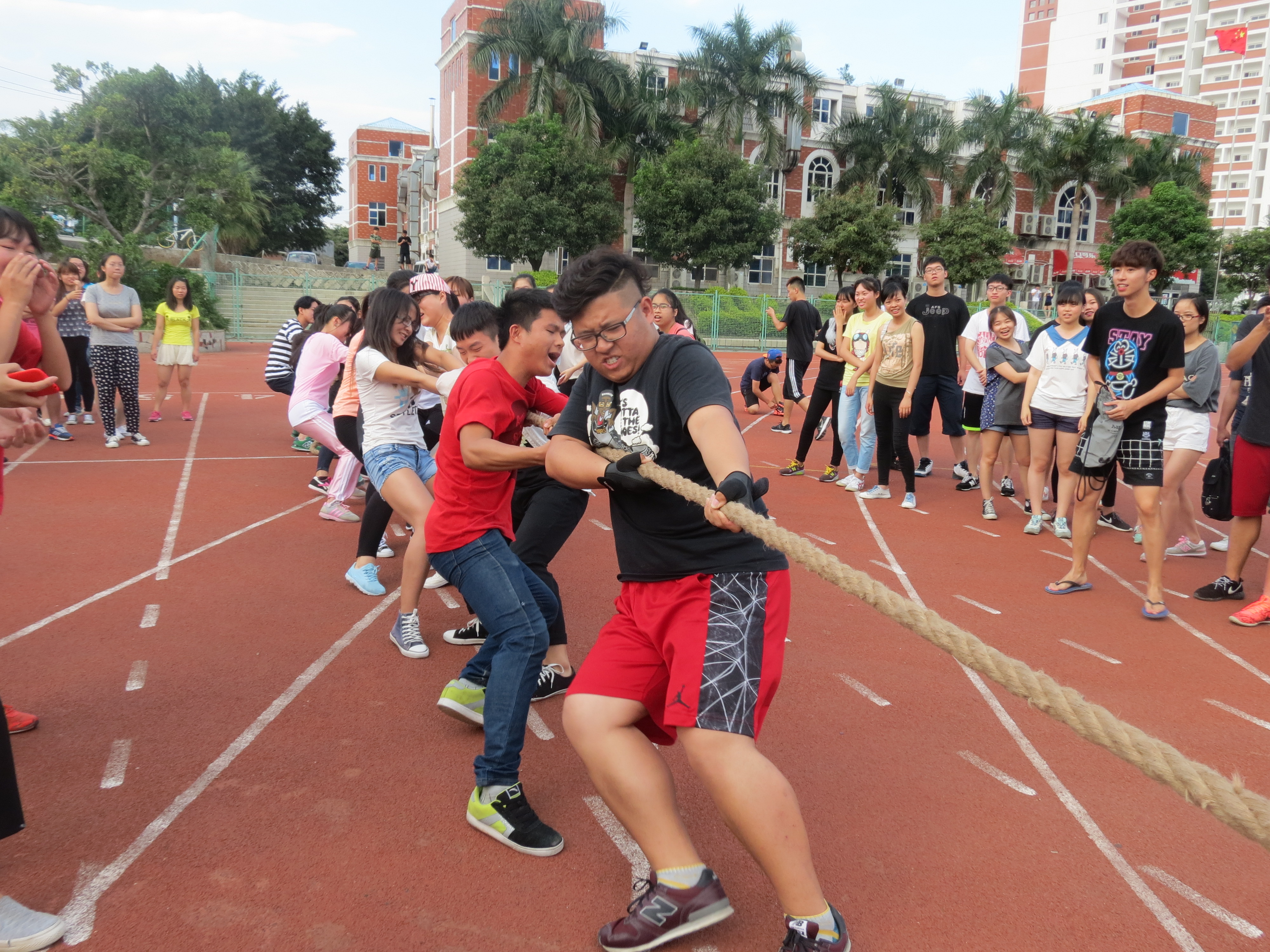 本报讯(记者杨浩张耿榕谈笑)5月14日下午,我院第五届阳光体育节之拔河比赛在操场如期举行。本次比赛由我院团委会和体育部联合主办,根据13、14级学生组成的16个团体,分为甲、乙两组进行角逐。其中,甲组由中文、文员、对外组成;乙组由广电、书法、广告和广告(闽台)组成。经过轮番竞赛,最终,14文一夺得甲组桂冠,13对外、13中二分别位于甲组第二第三名;乙组则由14广电、13广电荣获一、二名。