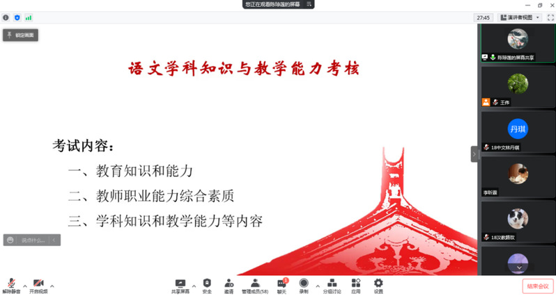 为了更好地推进2022届师范生教育教学能力(高级中学语文)的考核工作,文传学院学科语文教学团队运用腾讯会议系统,在4月9日晚上在线举办“2022届师范生教育教学能力考核说明会”。文传学院中文系主任、副主任,汉教系主任,学科语文教学团队骨干成员,以及在学研究生、文传学院与外国语学院的部分师范生参加本次活动。