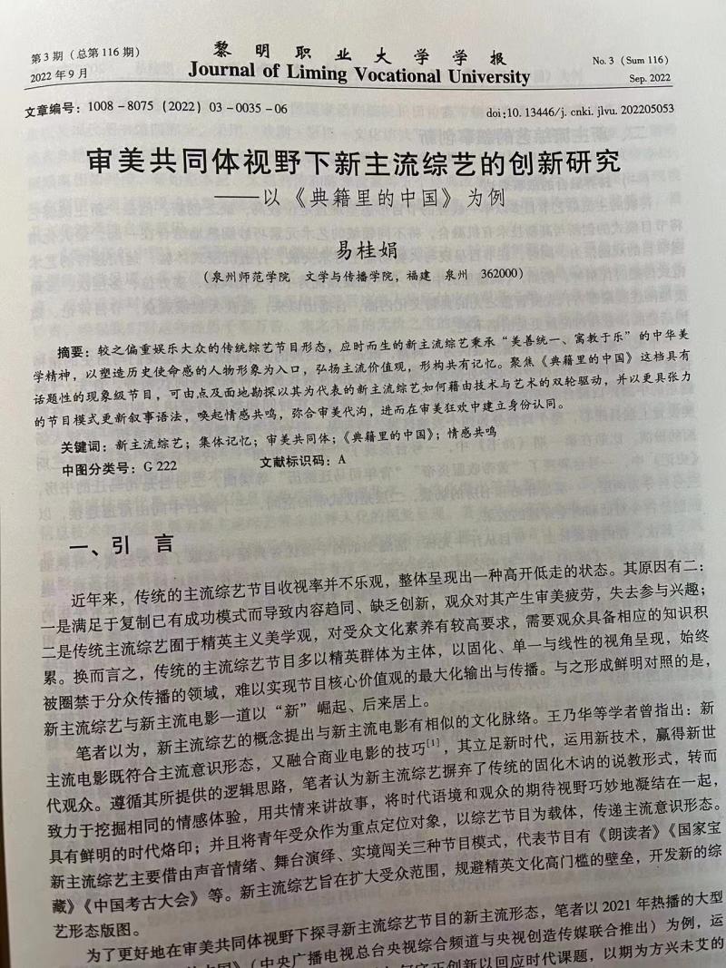文传学院2021级广播电视领域艺术硕士专业学位研究生易桂娟所撰写的《审美共同体视野下新主流综艺的创新研究》,在《黎明职业大学学报》2022年第3期发表。这篇论文即是其本人毕业论文的前期成果,亦是英国威廉希尔公司官网新文科研究与改革实践项目“新文科背景下院级共同课程学科建设探索与实践”(2021XWK007)、福建省本科高校教育教学改革研究项目(FBJG20210251)等教改项目的成效体现。
