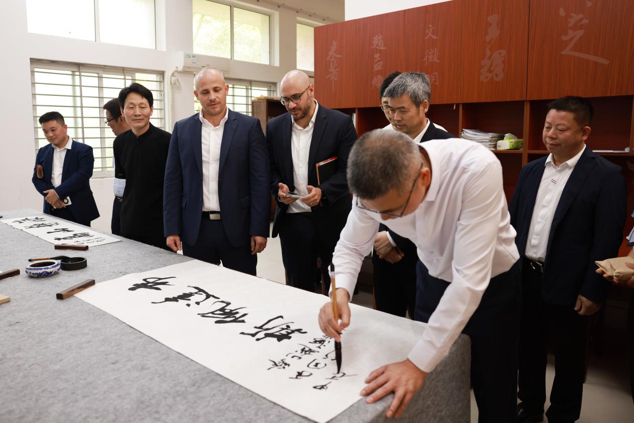 图为黄江昆副校长为来宾展示书法艺术