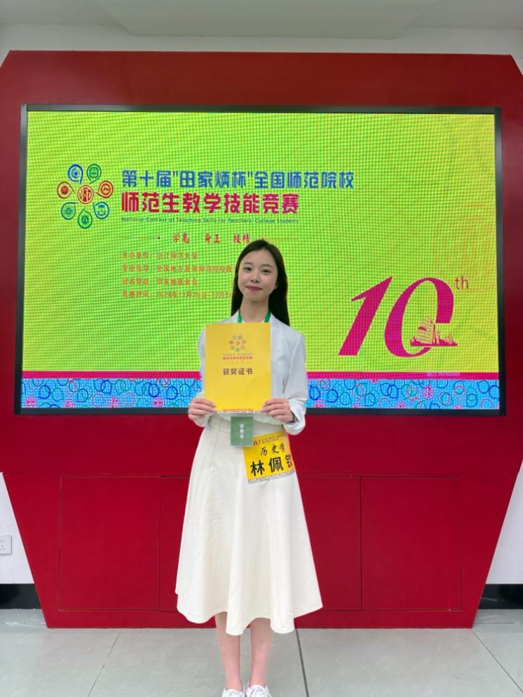 本次大赛由田家炳基金会冠名,浙江师范大学承办,比赛设置了历史学、汉语言文学、英语、思想政治教育等11个组别,共有来自155所院校的509名选手参加决赛。在决赛阶段,选手们通过教学设计、课件制作、即席讲演、模拟授课等环节展开激烈比拼,林佩钦同学凭借出色表现,最终斩获佳绩。