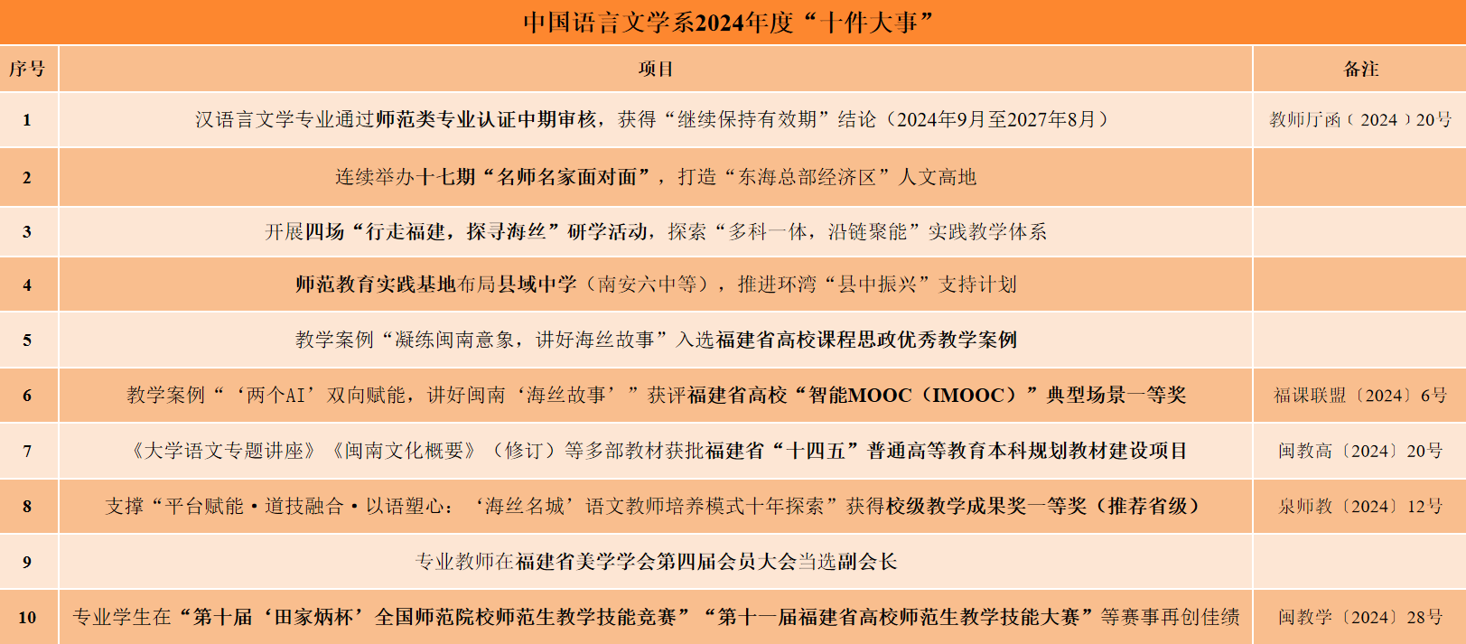 万物得其本者生,百事得其道者成”。在学校有关部门与文传学院的大力支持下,中文系以融入学科联盟为契机,传承千年海丝文脉,赓续百年师范传统,依托校级新文科研究与改革实践项目(2021XWK010)、福建省本科高校教育教学改革研究项目(FBJG20210251)等课题平台积极发挥福建省高校课程思政优秀教学案例“凝练闽南意象,讲好海丝故事”示范引领作用,放大增强福建省高校“智能MOOCIMOOC)”典型场景“‘两个AI’双向赋能,讲好闽南‘海丝故事’”辐射带动效应高标推进“环湾区域‘县中振兴’支持计划”与“数智时代‘闽派美学’复兴行动”,聚力打造厚积成势的国学研究东南高地因潮而兴的语文教育东海学派”,奋力谱写构建中国语言文学自主知识体系,发展数字文化产业新质生产力”的“泉师篇章”编辑校对王颖茹初审:李莉,复审:王伟)