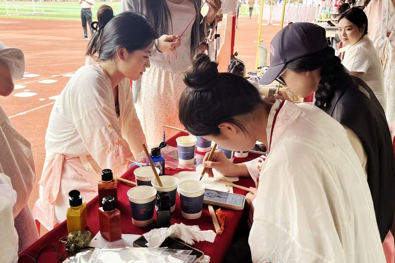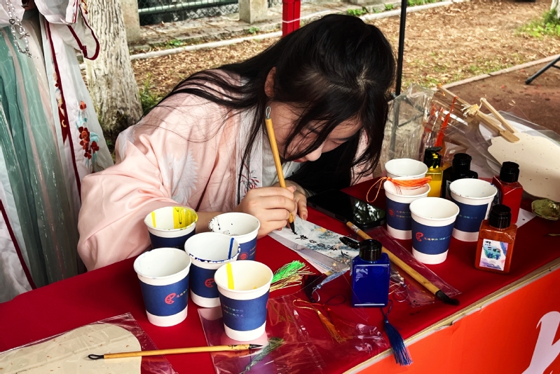 本次活动以“五色五雅”为核心,设置五个特色任务区。古铜区开展“‘铜’心启征途,薪火照新程”活动,以掷骰子答诗词的形式弘扬经典诗词文化;玄黑区“青春逢盛世,翰墨书华章”活动,学子进行团扇DIY创作,融入书法传递美好愿景;靛蓝区“古琴焕新曲,弦音蕴蓝图”活动,以古琴演奏展现传统民乐魅力;朱红区“丹心铸华夏,英雄长流芳”活动,通过制作香囊致敬革命英雄;官黄区“改革开放路,回顾辉‘黄’时”活动,学子现场品茶,感受传统茶文化。