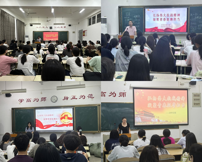 为深入学习习近平总书记在纪念中国人民抗日战争暨世界反法西斯战争胜利80周年大会上的重要讲话精神,引领青年学生坚定不移听党话、跟党走,传承和弘扬伟大抗战精神,文传学院辅导员于9月13-14日在2025级新生班级开展“弘扬伟大抗战精神,凝聚青春挺膺担当”主题班会。