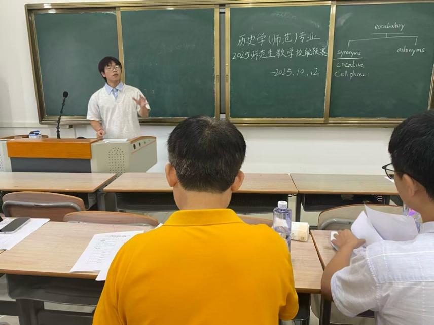 为进一步提升历史师范生的教学能力与专业素养,10月12日下午,历史系在俊秀东楼306教室举办了2025年省师范生教学技能大赛(初中历史组)校内预赛。本次活动由历史系主任刘智豪教授、城东中学高明爽老师、石光中学胡志章老师共同担任评委。历史系陈海蓉老师及部分师生到场观摩,共同见证了师范生成长与教学风采的精彩展示。