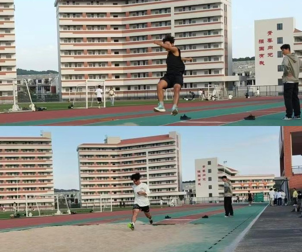 跳跃组涵盖跳高、跳远两大项目。两项目均对运动员的核心力量、身体协调能力和跳跃技巧有较高要求。为此,跳高组逢周一、周五进行运动员的体能强化训练,其余时间为上垫实操训练。跳远组则在统一的弹跳力核心训练之余,更有针对性地将急行跳远和三级跳远的训练进行分开指导,同时展开阶段性训练,并在第一阶段结束后进行考核。在科学的训练计划与适当的运动负荷下,跳跃组运动员一次次挑战极限,突破自我,敢于追求更高、更远的目标,以训练时的辛劳汗水培育成效后的累累硕果。