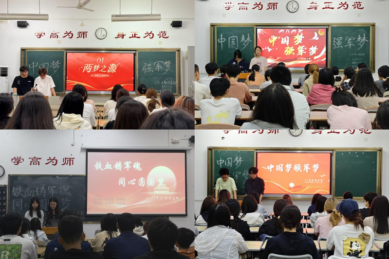 活动中,各班通过PPT展示、知识讲解等环节,帮助同学们学习相关知识。其中,25书法班以清晰的PPT呈现,讲解“中国梦”与“强军梦”的联系;25中文1班围绕“军魂”与“国家”二者之间密不可分的关系,以故事讲解开场,有力呈现了“兵强则国安”的重要性;25中文2班从自身专业出发,阐述青年在实现“两梦”中的责任;25汉教班则通过“两梦之源”等板块,呼吁同学们将强军精神转化为学习、生活中的动力。