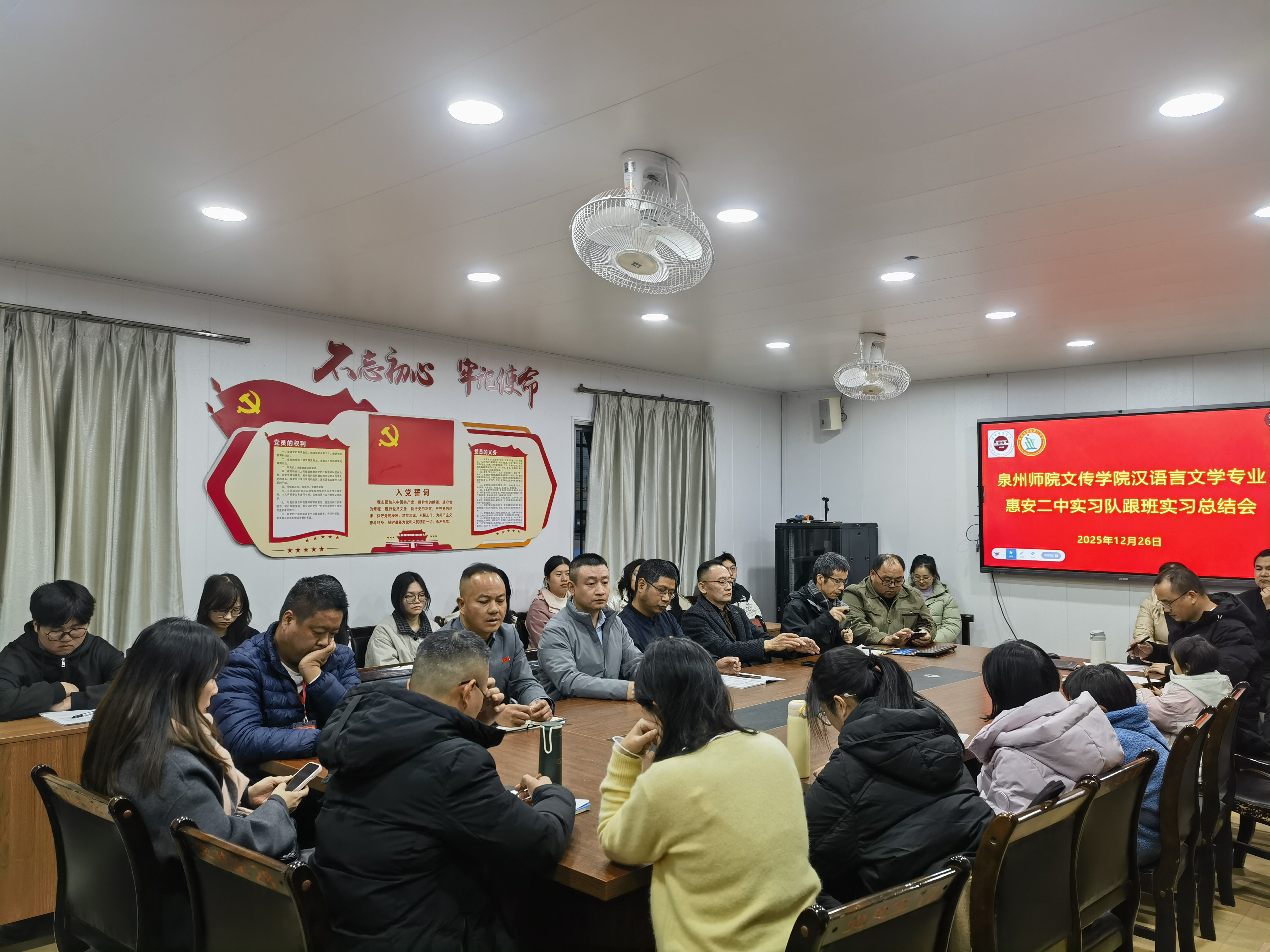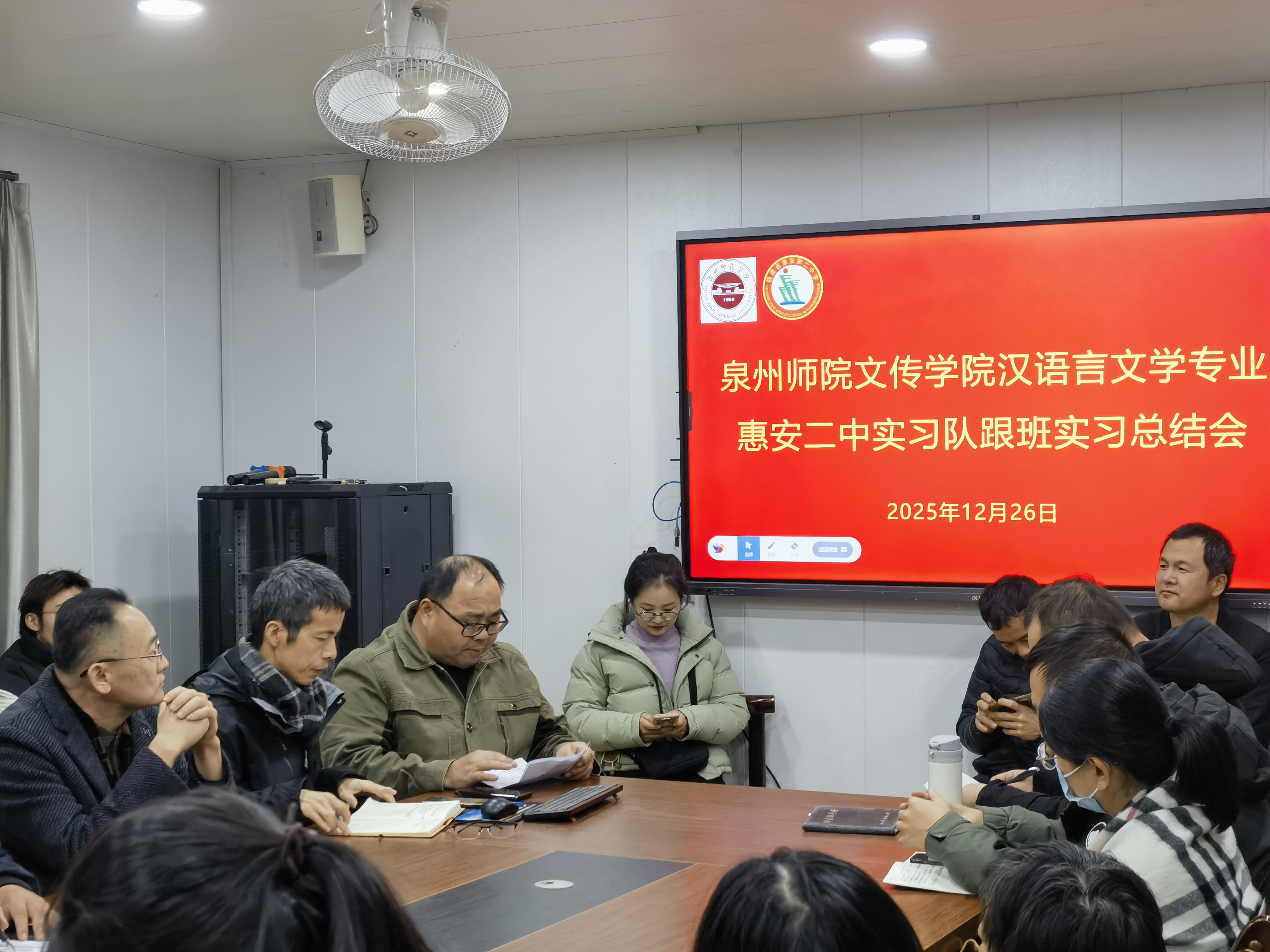 12月26日,文传学院汉语言文学师范专业学生在惠安二中的教育实习圆满收官。为全面复盘实习成果,深化校地协同育人成效,惠安二中隆重举行实习总结会。惠安二中校长及其各位领导、全体指导老师及我院带队老师及全体实习学生参会,会议在庄重而热烈的氛围中圆满结束。