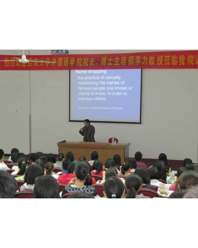 4月26日下午,英国驻华大使馆文化教育处英语教学顾问、教育部高等学校外语专业教学指导委员会委员、西南大学博士生导师李力教授莅临外国语学院,在孙中山礼堂第一学术报告厅为该院师生带来了一场题为《狗、孔子、海德格尔和猫——从一堂小学英语课引起的另类思考》的讲座。该院领导、部分师生听取了讲座。