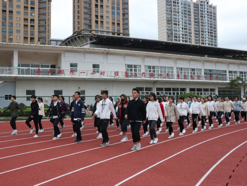 伴随着激昂的运动员进行曲,我院学子进入操场开始演练,独具学院特色的服装在操场上格外吸引眼球。仪仗队的同学带着自信的笑容,高举标有“外国语学院”的旗帜,紧随其后的排舞的同学们舞步整齐、激情四射,使操场上洋溢着青春的气息。接着,是由我院广播操队员和运动员组成的方阵,他们踏着整齐的步伐,大声喊着“外院,外院,魅力无限”的口号,展现了外院学子的蓬勃朝气。最后,广播操参赛队员以最阳光最饱满的状态做着整齐划一的动作,迎来了小教练们的声声赞扬。
