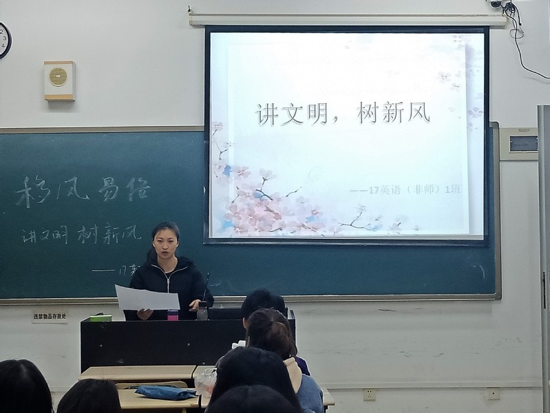 为深入贯彻习近平新时代中国特色社会主义思想,提升我院师生的文明素养,树立时代新风。3月10日晚七点许,我院2017级英语专业1班、2018级商务英语专业1班和2班分别于外文楼205、208、209教室开展以“移风易俗”为主题的班会。