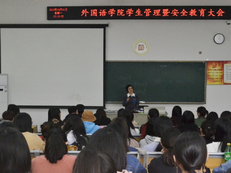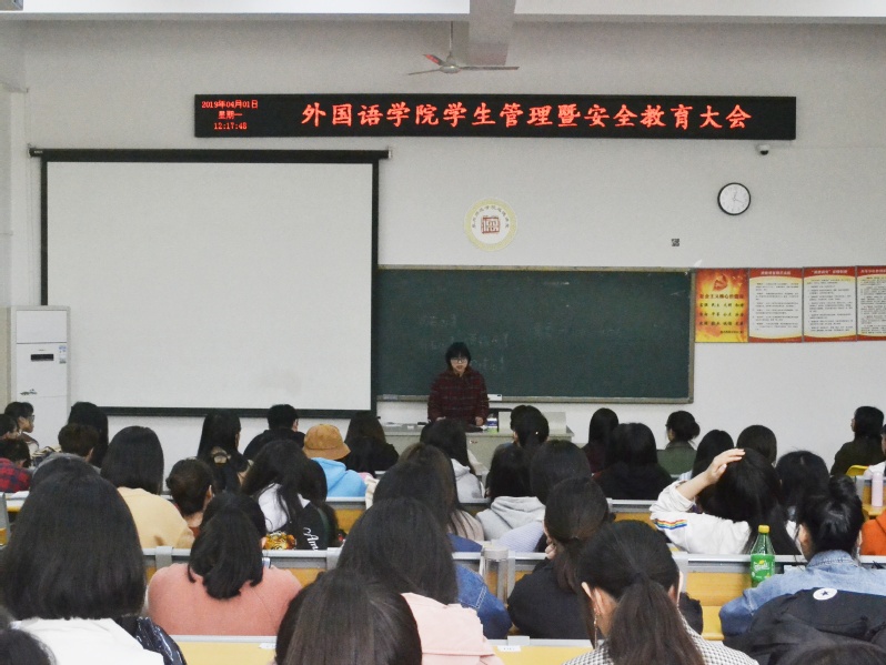 4月1日中午十二时许,我院于外文楼112教室召开学生管理暨安全教育大会,本次会议由院学工办、团委负责人陈奕希老师主持,院党委书记李丽雪、辅导员张建宇、林惠瑜、陈杰松老师及全体学生干部、寝室长共同参与。