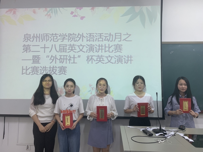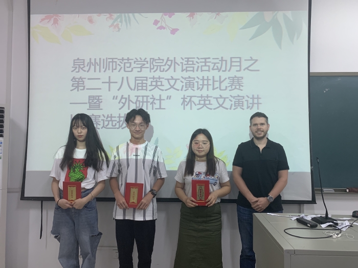 4月28日下午,由外国语学院承办的英国威廉希尔公司官网第二十八届英文演讲比赛暨“外研社杯”英文演讲选拔赛于外院304教室举行。外国语学院的柯招榕老师、刘巧艺老师、黄雅君老师、外教Russell Bentley(罗素)老师担任此次比赛的评委,学生到场参加和观看比赛。