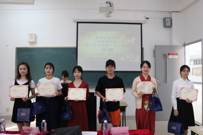 据悉,此次比赛参赛选手分为专业组和非专业组,选手们围绕主题,精心选材,用他们独特的方式表达了对祖国的无限热爱和内心的期盼。其中,非专业组的二号选手何凤琴同学深情朗诵《With My Broken Palm》,体现了对祖国母亲深沉的爱;再有非专业组的五号选手张悦平同学激情澎湃地朗诵了毛泽东的《沁园春·长沙》,表达出了毛主席对中华民族前途的乐观主义精神和以天下为己任的豪情壮志;后有专业组的三号选手王晨语同学的《歌颂党》,体现了新一代青年对中国共产党的爱戴和尊敬;最后,专业组的最后一名选手王朝龙同学声情并茂地朗诵了《我爱我的祖国》,体现了新时代新青年的爱国情怀,以及作为中华儿女的自豪。一篇篇热血沸腾的文章,一次次声情并茂的演绎,道出了先辈们的家国情怀,歌颂了他们坚定的理想信念,选手们精彩的朗诵赢得了现场的热烈掌声。通过激烈的角逐,专业组的王晨语同学和非专业组的杨萌萌同学以标准的语音、饱满且到位的情感,赢得了评委的肯定,摘得了此次比赛的桂冠。