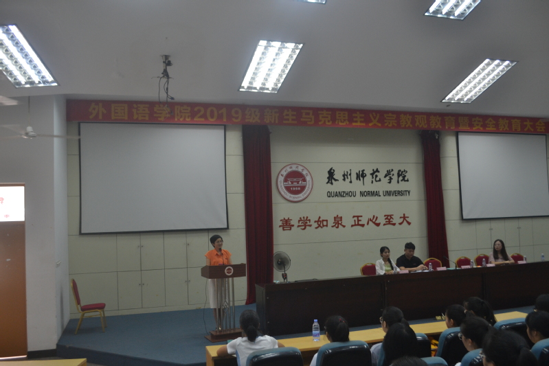 9月8日上午九时许,外国语学院于中山学术报告厅三楼召开2019级马克思主义宗教观教育暨安全教育大会,对2019级新生进行马克思主义宗教观、安全教育及学籍教育。学院党委书记李丽雪,全体辅导员、教务科老师及2019级全体同学参加了本次会议,会议由院学生工作办公室副主任、团委副书记陈奕希主持。