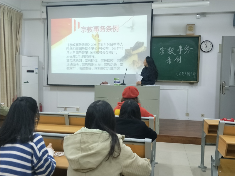 为深入贯彻党的民族宗教政策学习教育活动的精神,保证我校办学方向,帮助同学们树立正确的意识,维护学校正常的教育教学秩序,12月22日晚上7许,在各班班委的精心组织和指导下,利用散学集合时间,组织外国语学院全体学生在教室举办了以“关于宗教事务条例”为主题的班会。通过本次主题班会,进一步加强了学院的管理,完善了各类规章制度,把学校办成健康向上,追求真理,学习科学的园地,增强全体师生抵御唯心主义和宗教思想的能力。