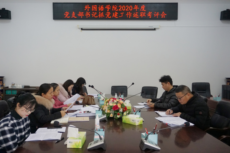 1月11日上午,外国语学院党委在俊秀外文楼113室召开2020年度党支部书记抓党建工作述职考评会,会议由学院党委书记蒋双霖主持,各党支部书记参加了会议。
