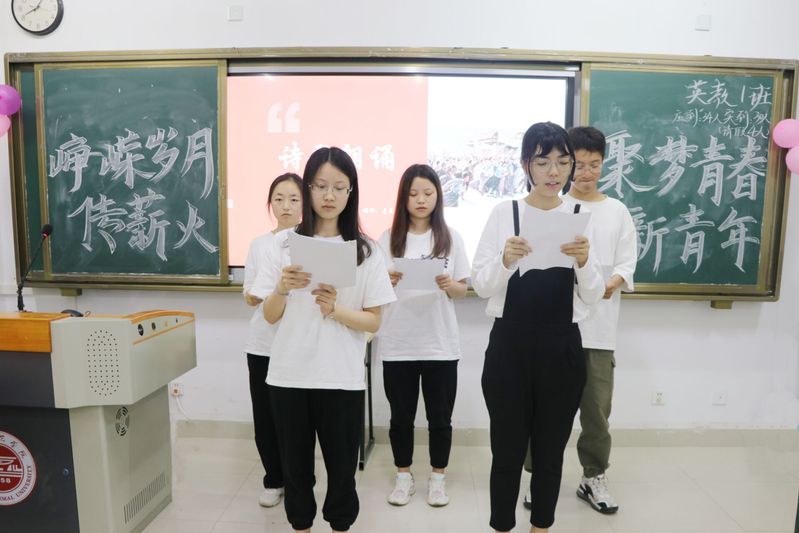为纪念“五四运动”九十周年,深入学习习近平新时代中国特色社会主义思想,弘扬爱团、爱党、爱国精神, 4月24日晚七时许,我院2020级英语(师范类)1班、2班、4班分别于外文楼310、309、308教室开展以“五四精神薪火传,百年党史峥嵘路”为主题的班团日活动。