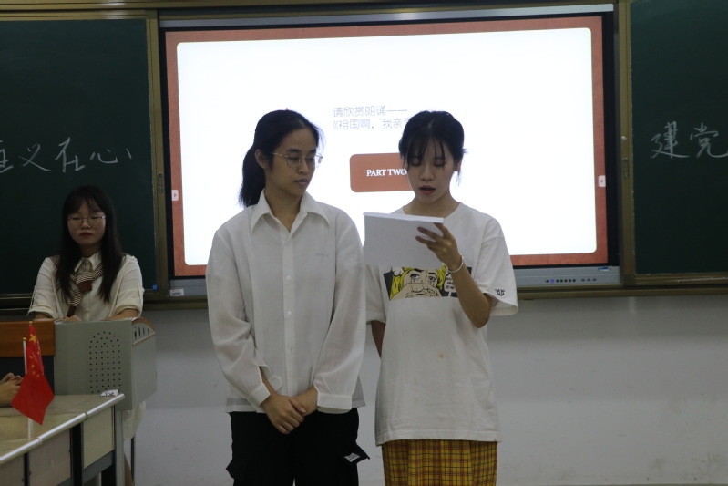活动伊始,英语(师范类)1班的同学观看了视频《中国人的浪漫》,共同回顾了祖国的光辉历史。同学们感受到正是因为有一代代共产党人凝聚起实现国家富强的强大力量,才谱写了中华民族可歌可泣的壮丽篇章。英语(师范类)2班的同学带来精彩的朗诵——《祖国啊,我亲爱的祖国》,每一段话语都沉淀着对祖国的深深热爱,铿锵有力的声音汇成最坚定的信念,激起了大家心中澎湃的爱国情怀。在英语(师范类)3班,开展的建国历程答题小比赛掀起了活动的高潮。大家都参与其中,激烈地抢答。通过这个小比赛,同学们更加深刻地了解了祖国从弱到强的艰苦发展历程。最后,各班主持人对本次活动做出总结,希望大家牢记新使命,在以后的岁月里努力学习,把伟大建党精神继承下去,发扬光大。