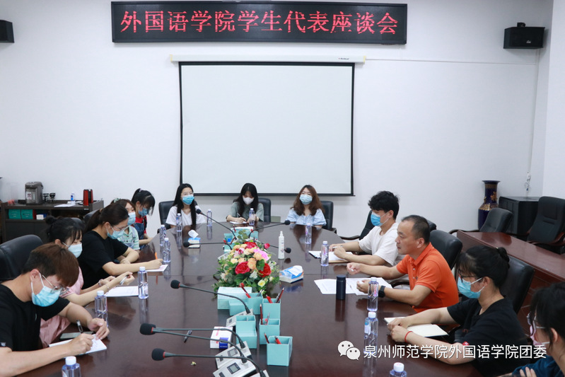 5月30日下午,外国语学院在外文楼113教室召开了学生代表座谈会。院党委副书记林伟荦、全体辅导员和来自不同专业年级班级的学生代表参加了座谈会。