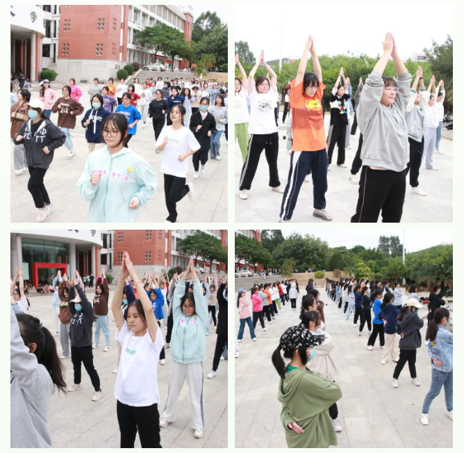 跟着音乐的律动节拍,在小教练们的带领与指导下,保证每位同学掌握动作要领,为了动作的整齐划一,大家不断练习着每个动作,力求做到完美娴熟,灵活地转动身体、挥舞手臂,一昂首、一弯腰、一举手、一投足,招招式式潇洒自信,风采无限,展现了青年朝气蓬勃的精神面貌。