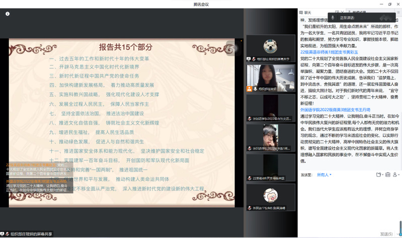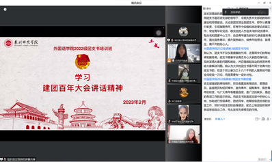 此次培训会通过腾讯会议召开,我院2022级各团支部书记参加。培训会围绕团支部职能与团支书工作职责、习近平总书记在建团百年大会上的重要讲话精神、党的二十大精神要义以及习近平总书记对青年的青春寄语和殷殷嘱托进行学习研讨。