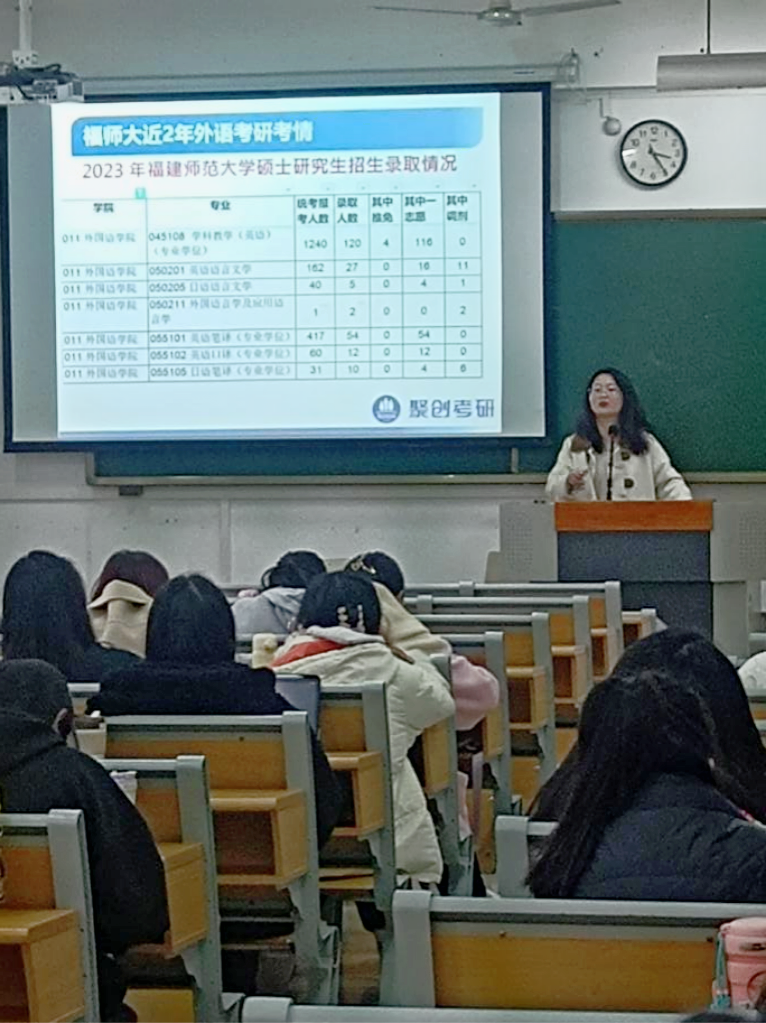 为引导学生明确备考方向、做好备考规划,外国语学院于2024年3月6日和3月8日,邀请聚创教育来校开展考研指导讲座,2021级全体学生参加讲座。