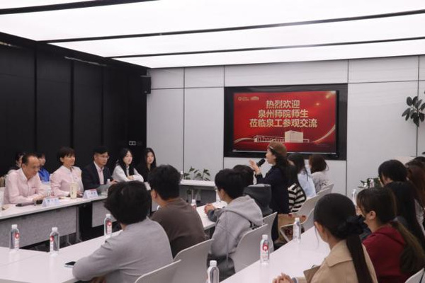 第一站,同学们走进福建泉工股份有限公司。在企业工作人员的引导下,大家先后了解企业发展历程、生产模式及全球业务布局,实地参观生产车间、学习企业管理制度。公司董事长傅炳煌、外贸总监陈静宜等高层管理人员对同学们的到来表示热烈欢迎,并与同学们开展亲切交流。答疑环节中,企业高层耐心解答同学们关于职业发展路径、行业发展趋势的疑问,深入阐述泉工股份的核心优势与未来发展前景,同时表达了对商务英语专业复合型人才的迫切需求,为同学们精准对接职场需求提供了清晰指引。