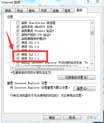 4.连接服务器时,如出现“无法连接到服务端,请检查网络是否可用”,请打开IE浏览器的Internet选项,点击高级,勾选“使用TLS1.1”“使用TLS1.2”,并点击确定。因WinXP和IE8已停止更新多年,存在严重安全隐患,VPN服务不再支持WinXP和IE8。