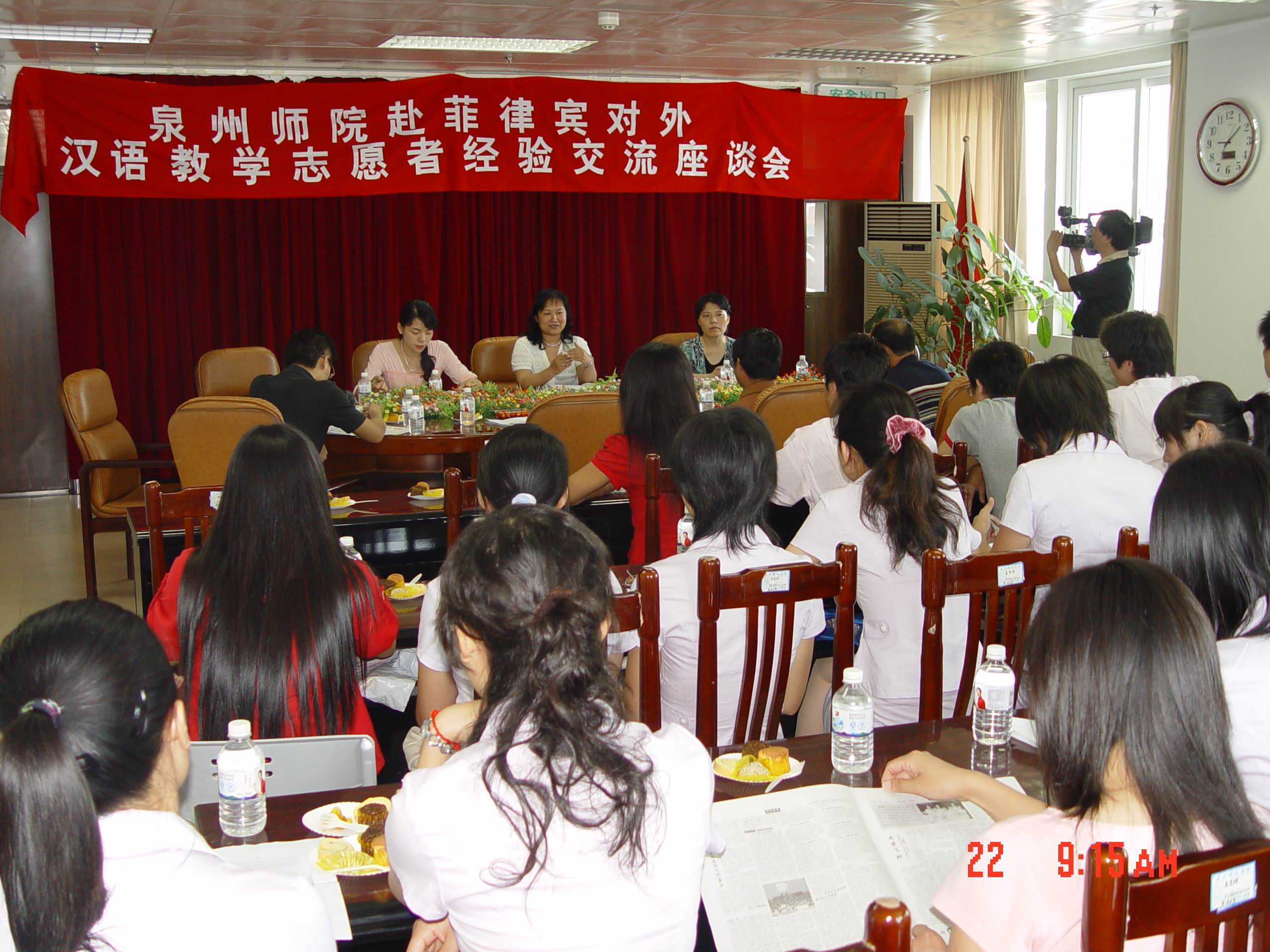 在交流会上,2006年度志愿者带队老师及志愿者介绍了在菲律宾的工作经验、将自身的感受与新志愿者交流,到会老师分别作了讲话,会场气氛热烈, 2007年度志愿者纷纷表示将在菲努力工作,不辱使命。
