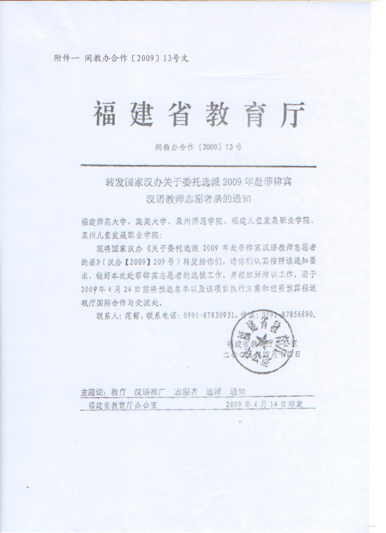 我校接省教育厅闽教办合作〔2009〕13号文《转发国家汉办关于委托选派2009年度赴菲律宾汉语教师志愿者函的通知》,要求我校认真做好本次赴菲律宾志愿者的选派工作。我办现将文件转发给你部门,请根据文件要求,推荐符合条件的应届毕业生报名参加2009年度赴菲律宾汉语教师志愿者的选拔。