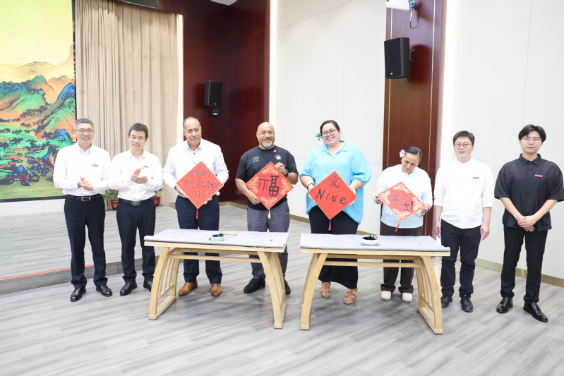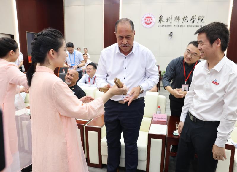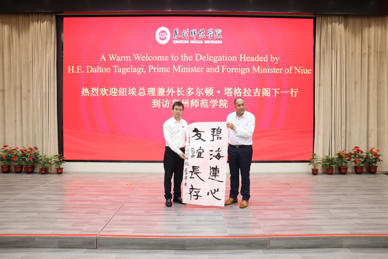 多尔顿·塔格拉吉一行听取了国际交流与合作处对学校面向太平洋岛国培训项目的专题介绍,观看纪实视频;欣赏由师生们带来的古琴、书法、茶艺以及南音等中华优秀传统文化展示;品尝了学生们奉上的飘香的铁观音;兴致勃勃地体验书法,在书法老师的指导下现场用毛笔写下“ Love QNU”“福”和“爱NIUE”等动人的文字;反复摸索,体验用南音四宝发出清脆声音的乐趣。